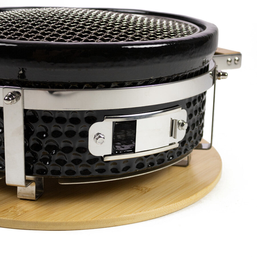 Lo Shichirin, chiamato anche griglia da tavolo giapponese, è realizzato in ceramica con quarzo, cordierite e cotto ad alta temperatura. La ceramica rende inoltre lo Shichirin molto facile da pulire. Regolando i cursori di ventilazione, si crea la perfetta circolazione dell'aria, consentendo di giocare con la temperatura e di raggiungere facilmente temperature elevate. Il barbecue giapponese è perfetto anche per l'uso invernale, poichè il rivestimento in ceramica lo protegge anche da pioggia e neve, rendendolo resistente alle intemperie. La griglia è splendidamente rifinita con dettagli in bambù e acciaio inossidabile.